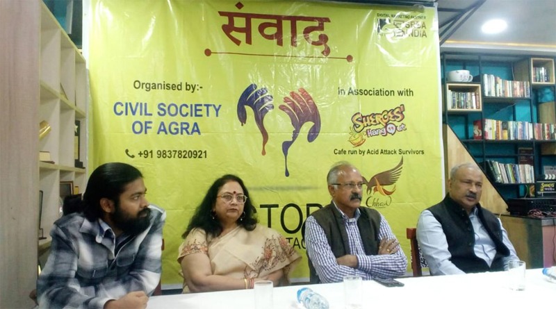 आगरा : एम जी न्यूज़ नेटवर्क : छाँव फ़ाउंडेशन के सहयोग से सिविल सोसाइटी ऑफ आगरा द्वारा आयोजित महिला उत्पीड़न और महिलाओं से सबंधित अपराध पर ‘’संवाद‘’ कार्यक्रम का आयोजन शीरोज हैंगआउट कैफे मे किया गया जिसमे मुख्य अतिथि के रूप मे एडीजी ज़ोन (अपर पुलिस महानिदेशक) श्री राजीव कृष्ण उपस्थित रहे |