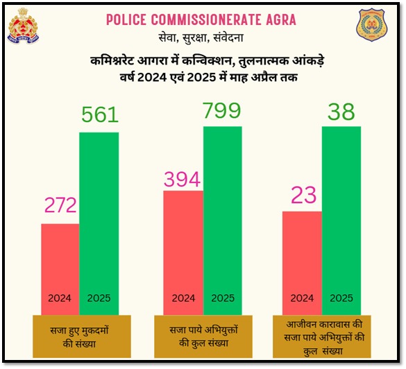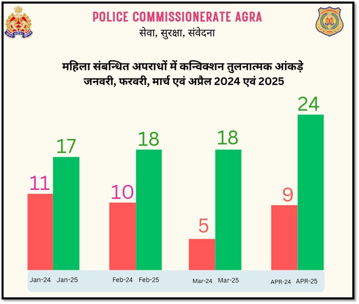 एम जी न्यूज़ नेटवर्क : आगरा : पुलिस कमिश्नरेट आगरा द्वारा आगरा पुलिस द्वारा किये गए कार्यों का वर्ष 2024 की तुलना में वर्ष 2025 मार्च काट किये गए कार्यों का एक तुलनात्मक विवरण प्रस्तुत किया गया है जिसे आगरा पुलिस द्वारा अपने सोशल मीडिआ पेज पर ” सशक्त प्रयास, सकारात्मक परिणाम ” शीर्षक से पोस्ट भी किया गया है | आपको बता दें कि आगरा पुलिस द्वारा अपने सोशल मीडिआ पेज पर जारी की गई पोस्ट में बताया कि पुलिस आयुक्त, आगरा श्री दीपक कुमार के निर्देशन में ऑपरेशन कन्विक्शन, परिवार परामर्श केन्द्र, महिला बीट पुलिस अधिकारी व एण्टी रोमियों टीमों के संयुक्त प्रयासों से महिला अपराधों में आई कमी