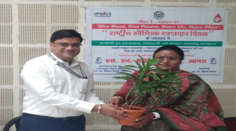 एम जी न्यूज़ नेटवर्क : आगरा : शुक्रवार को एसएन मेडिकल कॉलेज के ब्लड बैंक द्वारा रक्तदाताओं को सम्मानित करने के लिए एक रक्तदान सम्मान समारोह आयोजित किया गया जिसमे रक्तदाताओं को प्रशस्ति पत्र देकर सम्मानित किया गया | एस एन मेडिकल कॉलेज के प्राचार्य डॉक्टर प्रशांत गुप्ता ने उन्होंने बताया कि रक्तदान शिविर से एक वर्ष में लगभग 4050 यूनिट रक्त प्राप्त हुआ हैं प्राप्त हुए रक्त को कई प्रकार से इस्तेमाल में लिया जा सकता है | अपनी बात को जारी रखते हुए प्रधानाचार्य डॉक्टर प्रशांत गुप्ता ने आगे  कहा कि गरीब दूर दराज के मरीज को रक्तदान के माध्यम से अत्यंत लाभ हो रहा है,  डॉ नीतू चौहान एवं टीम द्वारा बेहतरीन व्यवस्था करी जा रही है जिससे की मरीजों के लिए रात के एक बजे भी रक्त की उपलब्धता हो रही है ।